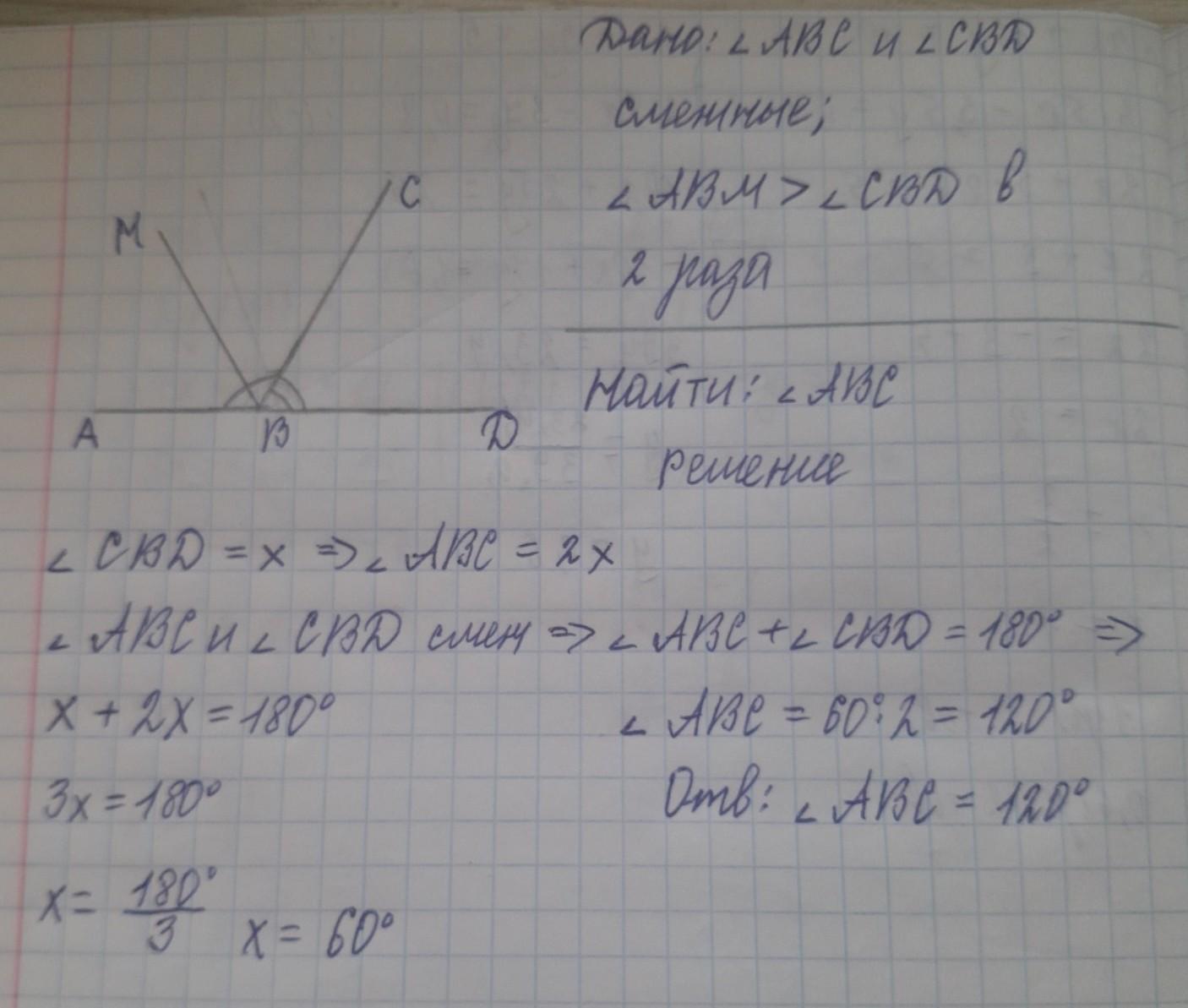 Кути АВС та CBD -суміжні, промінь ВМ -бісектриса кута АВС, а кут АВМ у два рази більший за кут CBD Знайдіть градусну міру кута АВС