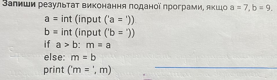 Объяснение: a > b, а превращается в m = a. m = b. b = 9, выведет 9 9