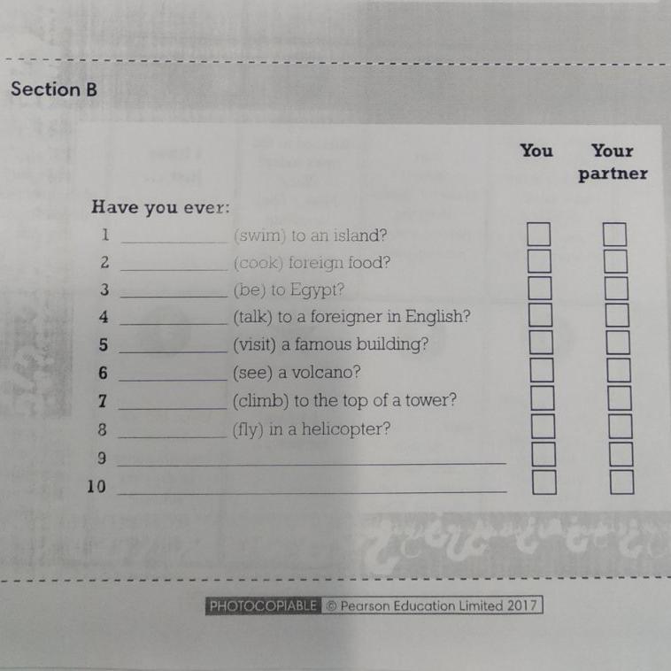 1. Have you ever swum 2. Have you ever cooked 3. Have you ever been 4. Have you ever talked 5. Have you ever visited 6. Have you ever seen 7. Have you ever climbed 8. Have you ever flown in a helicopter?