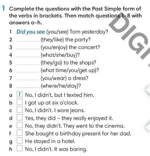 1 Did you see (you/see) Tom yesterday? 2 (they/like) the party? (you/enjoy) the concert? (what/she/buy)? 3 45678 a b с d e f g h (they/go) to the shops? (what time/you/get up)? (you/wear) a dress? (where/he/stay)? DIGITA 7 No, I didn't, but I texted him. I got up at six o'clock. No, I didn't. I wore jeans. Yes, they did they really enjoyed it. No, they didn't. They went to the cinema. She bought a birthday present for her dad. He stayed in a hotel. No, I didn't. It was boring.