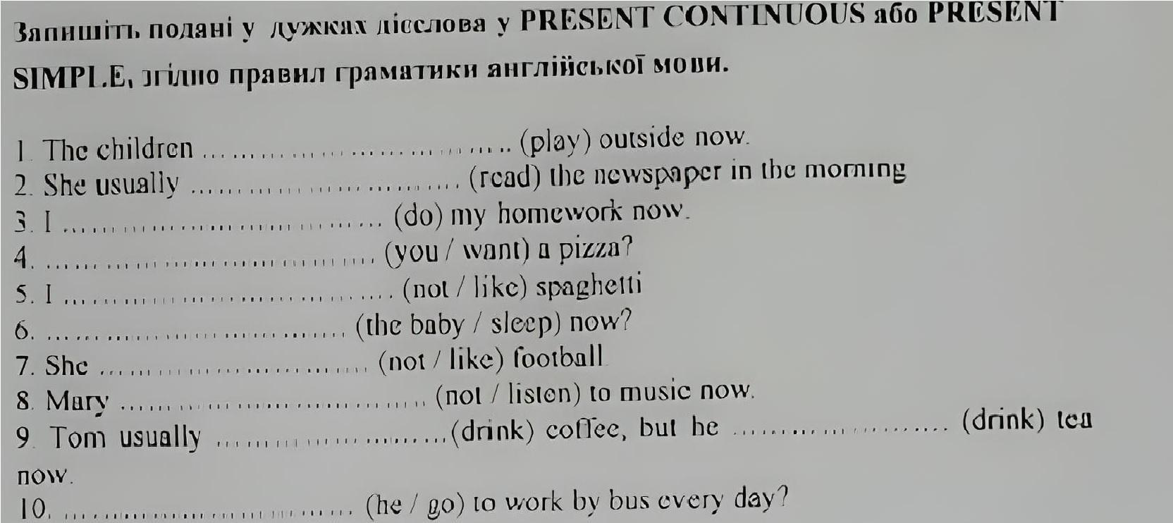1. The children are playing outside now. 2. She usually reads the newspaper in the morning. 3. I am doing my homework now. 4. Do you want a pizza? 5. I don't like spaghetti. 6. Is the baby sleeping now? 7. She doesn't like football. 8. Mary is listening to music now. 9. Tom usually drinks coffee, but he is drinking tea now. 10. Does he go to work by bus every day?