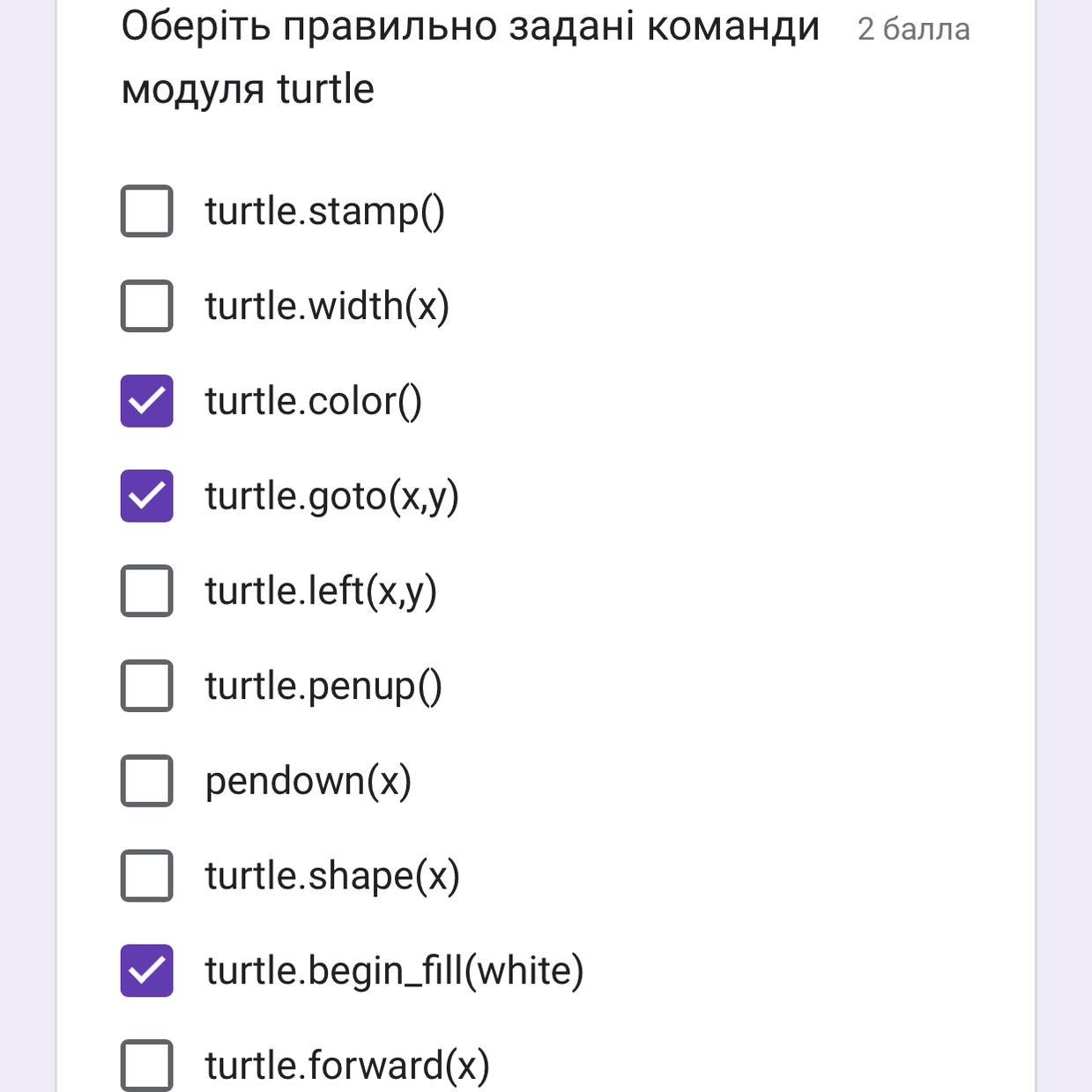 turtle.begin_fill(white) - метод begin_fill() не потребує передачі кольору, щоб заповнити фігуру, тому правильною буде команда turtle.begin_fill() без передачі кольору.