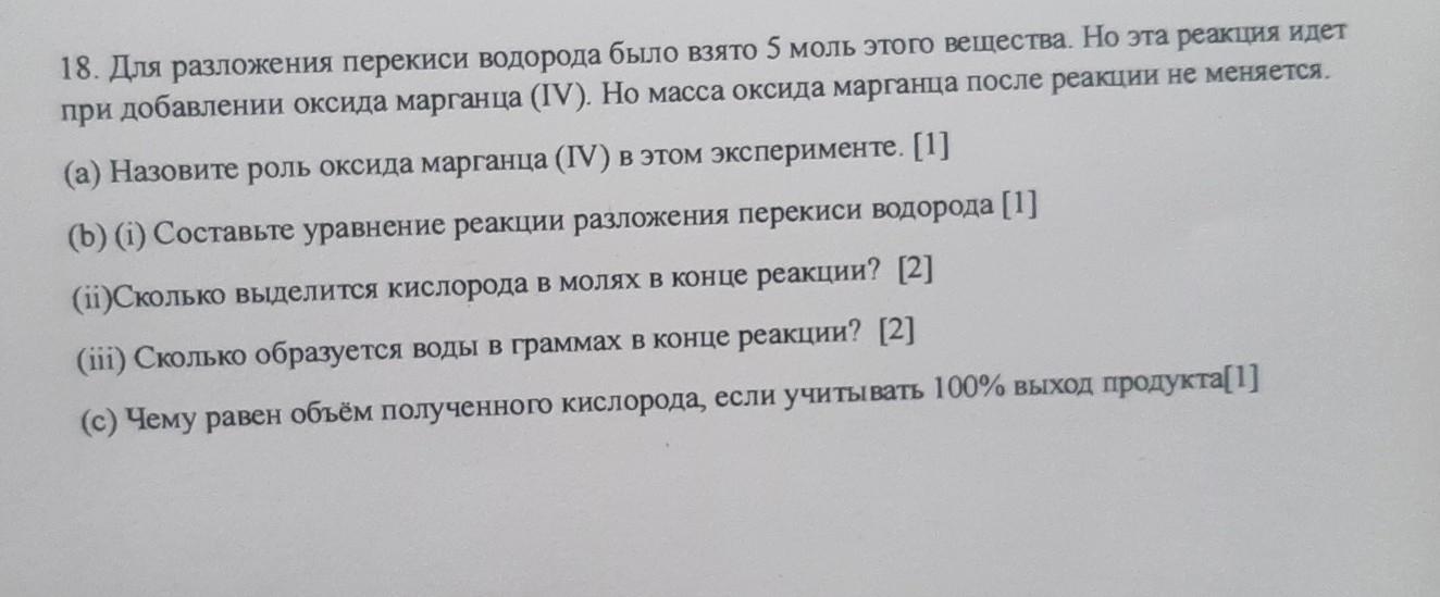 18. Для разложения перекиси водорода было взято 5 моль этого вещества. Но эта реакция идет при добавлении оксида марганца (IV). Но масса оксида марганца после реакции не меняется. (а) Назовите роль оксида марганца (IV) в этом эксперименте. [1] (b) (i) Составьте уравнение реакции разложения перекиси водорода [1] (її)Сколько выделится кислорода в молях в конце реакции? [2] (iii) Сколько образуется воды в граммах в конце реакции? [2] (c) Чему равен объём полученного кислорода, если учитывать 100% выход продукта[1]