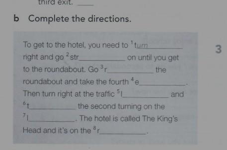 b Complete the directions. To get to the hotel, you need to 'tum right and go 2 str to the roundabout. Go ³r on until you get the roundabout and take the fourth e Then turn right at the traffic 5 6t 71 Head and it's on the r and the second turning on the The hotel is called The King's 3