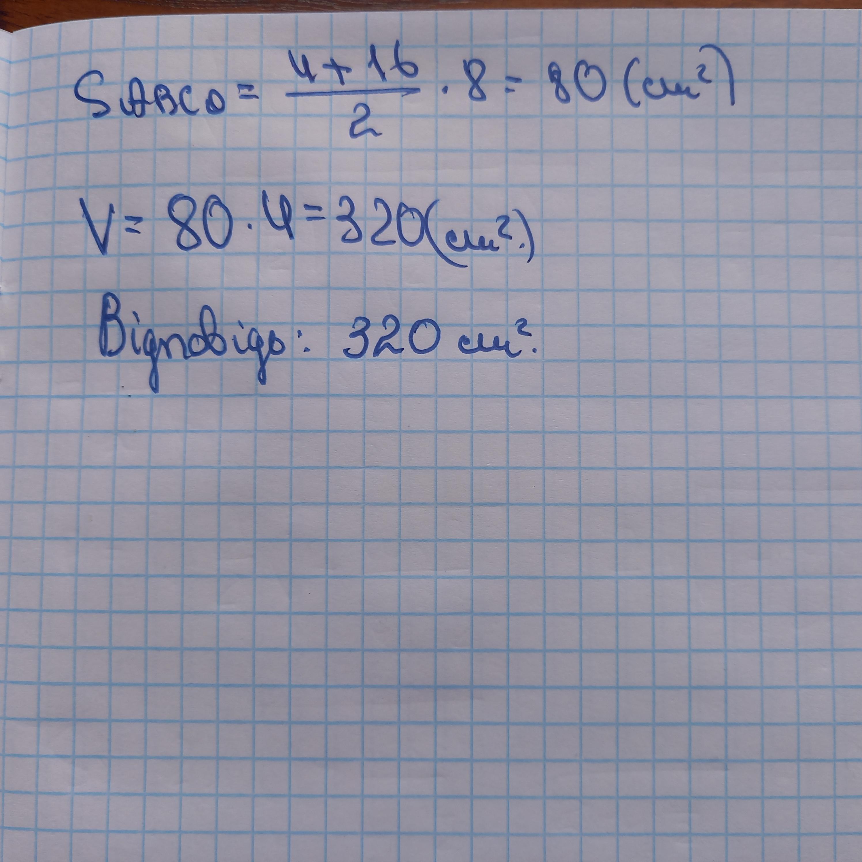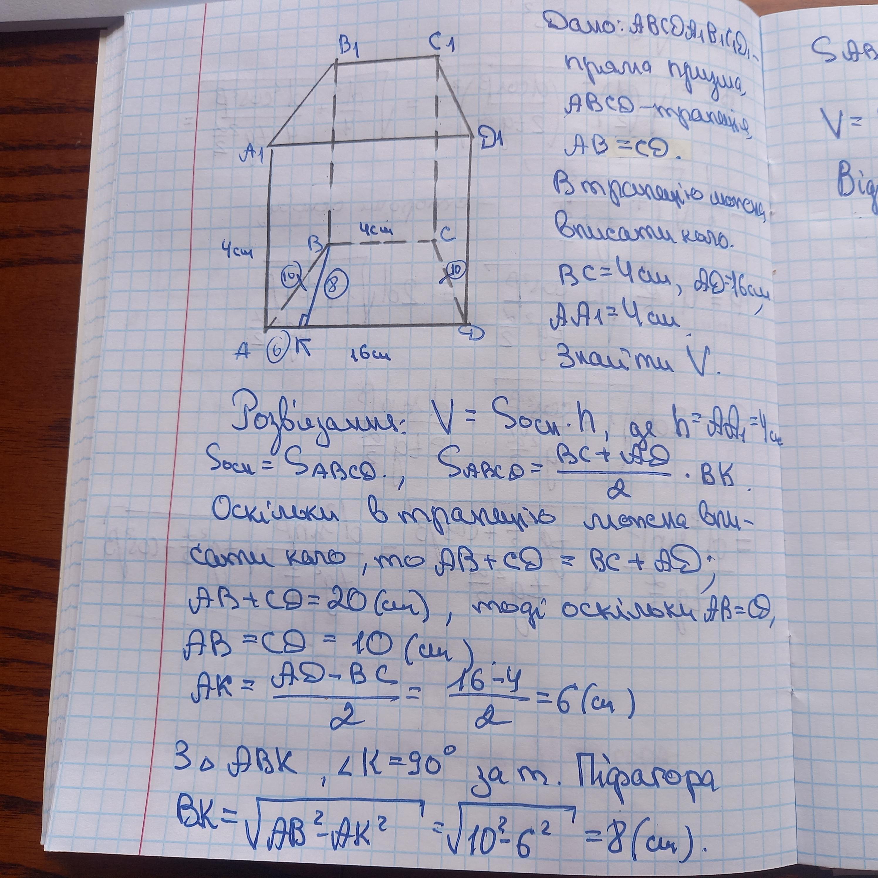 Основою прямої призми є рівнобічна трапеція, в яку можна вписати коло. Основи цієї трапеції дорівнюють 4 см і 16 см, а бічне ребро призми дорівнює 4 см. Знайти об'єм призми.