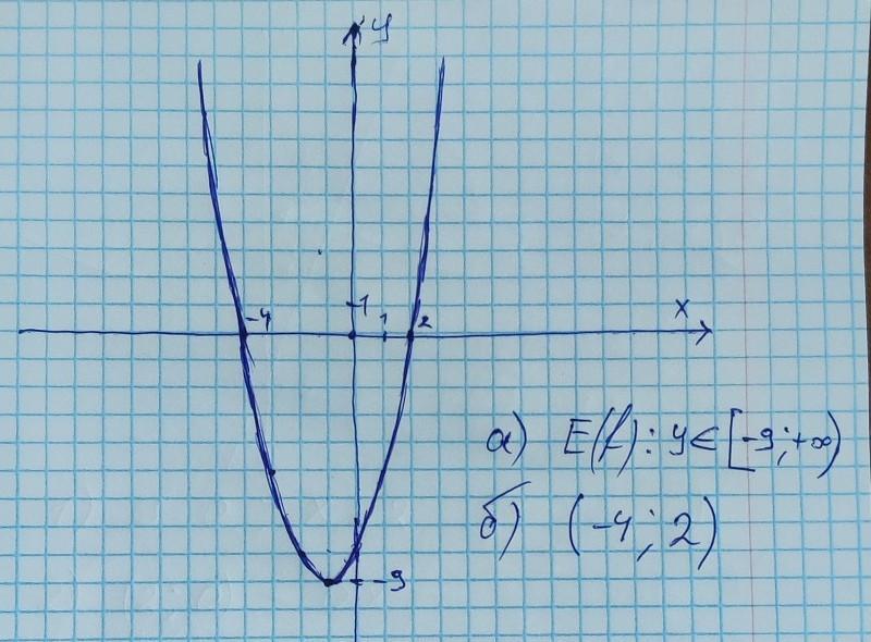 Побудувати графік функції у=x² + 2x-8. Використовуючи побудований графік, знайти: а) множину значень функції; б) при яких х функцiя приймає вiд'ємні значення?