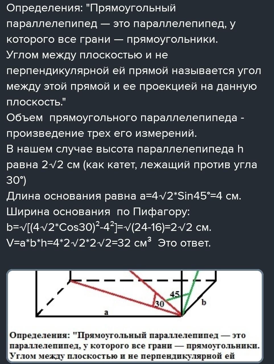 Найдите объем прямоугольнного параллелепипеда, если угол между его диагональю и боковой гранью составляет 30⁰, а в основании лежит квадрат со стороной равной 2√2