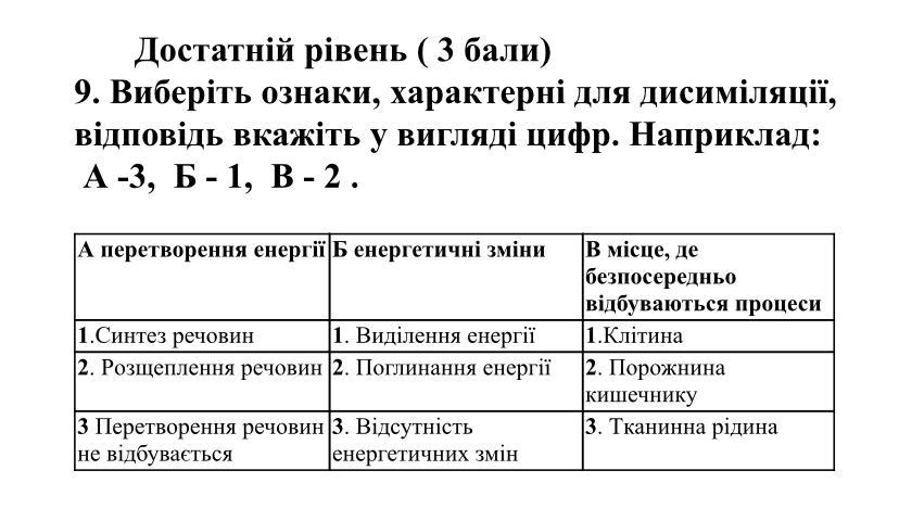 Правильна відповідь - В) 1, 2, 1. Бо при дисиміляції відбувається розщеплення речовин, вивільнення енергії, а місцем, де все це відбувається, є клітина.