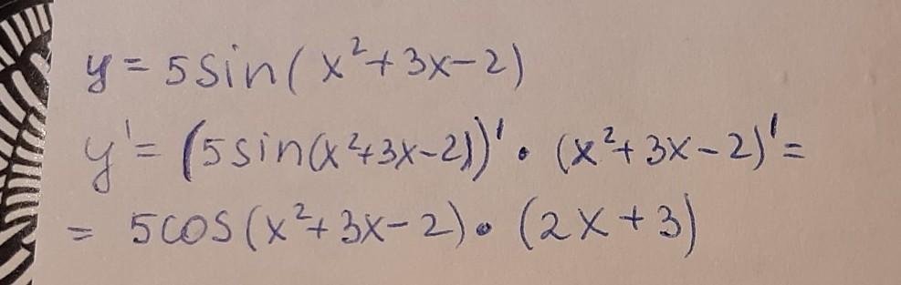 Таким образом, производная функции f(x) = 5sin(x^2 + 3x - 2) равна f'(x) = 5 * cos(x^2 + 3x - 2) * (2x + 3).