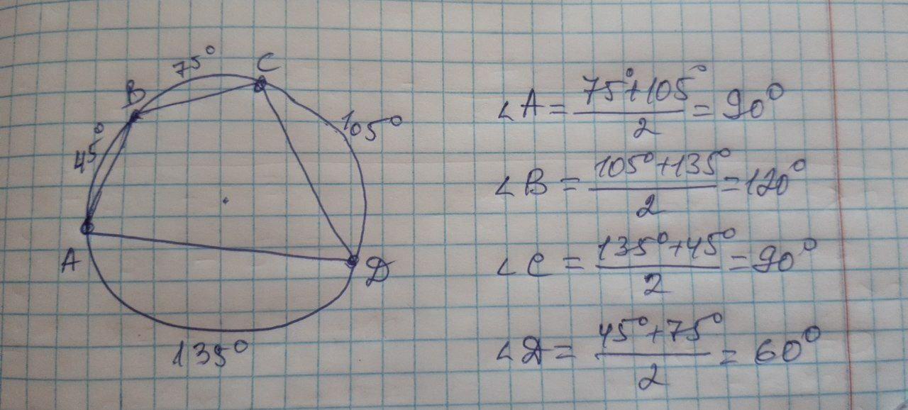 Дано: точки ABCD, поділяють коло на чотири дуги так,що дуга AB: дугу BC:дугу CD:дугуAD = як,3:5:7:9