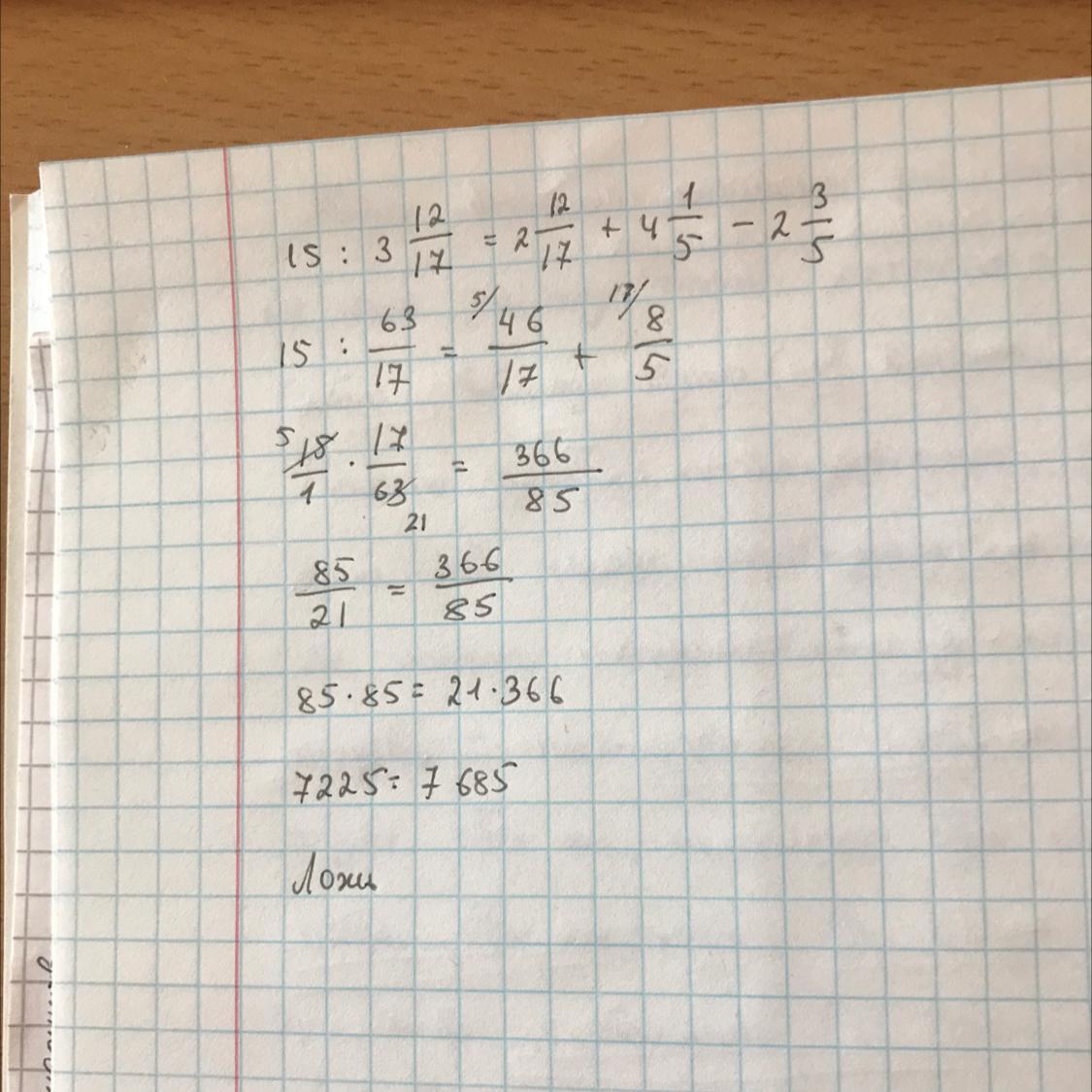 а) 15 : 3 12/17=2 5/17+4 1/5 - 2 3/5 : 4, я забыл дописать что надо поделить на четыре