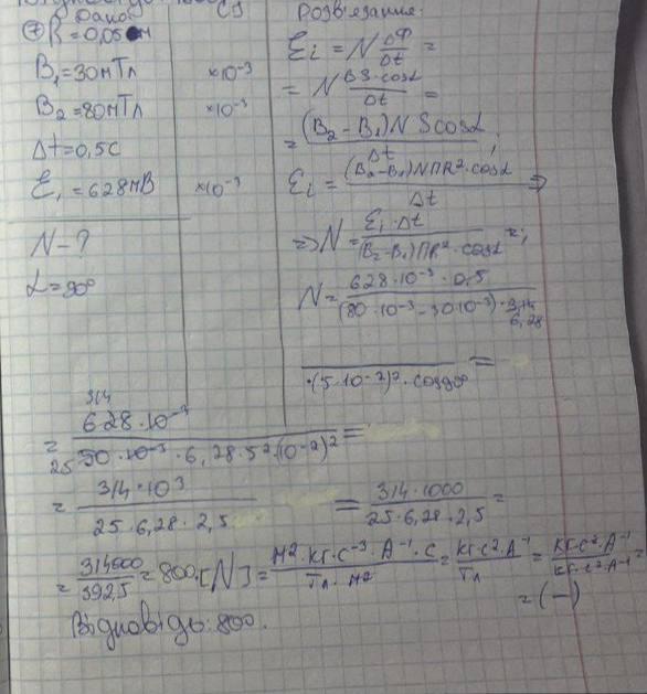 магнітного поля до 30 мТл протягом 0,5 с у кільці виникла ЕРС індукції 628 мВ. Зі скількох