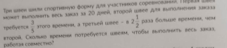 Три швеи шили спортивную форму для участников соревнований. Первая швея может выполнить весь заказ за 20 дней, второй швее для выполнения заказа - в 3/5 раза больше времени, чем требуется этого времени, а третьей швее 2 1/2 больше времени чем второй . Сколько времени потребуется швеям, чтобы выполнить весь заказ. работая совместно?