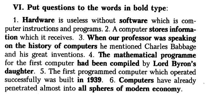 1. Hardware is useless without software which is com- puter instructions and programs. 2. A computer stores informa- tion which it receives. 3. When our professor was speaking on the history of computers he mentioned Charles Babbage and his great inventions. 4. The mathematical programme for the first computer had been compiled by Lord Byron's daughter. 5. The first programmed computer which operated successfully was built in 1939. 6. Computers have already penetrated almost into all spheres of modern economy