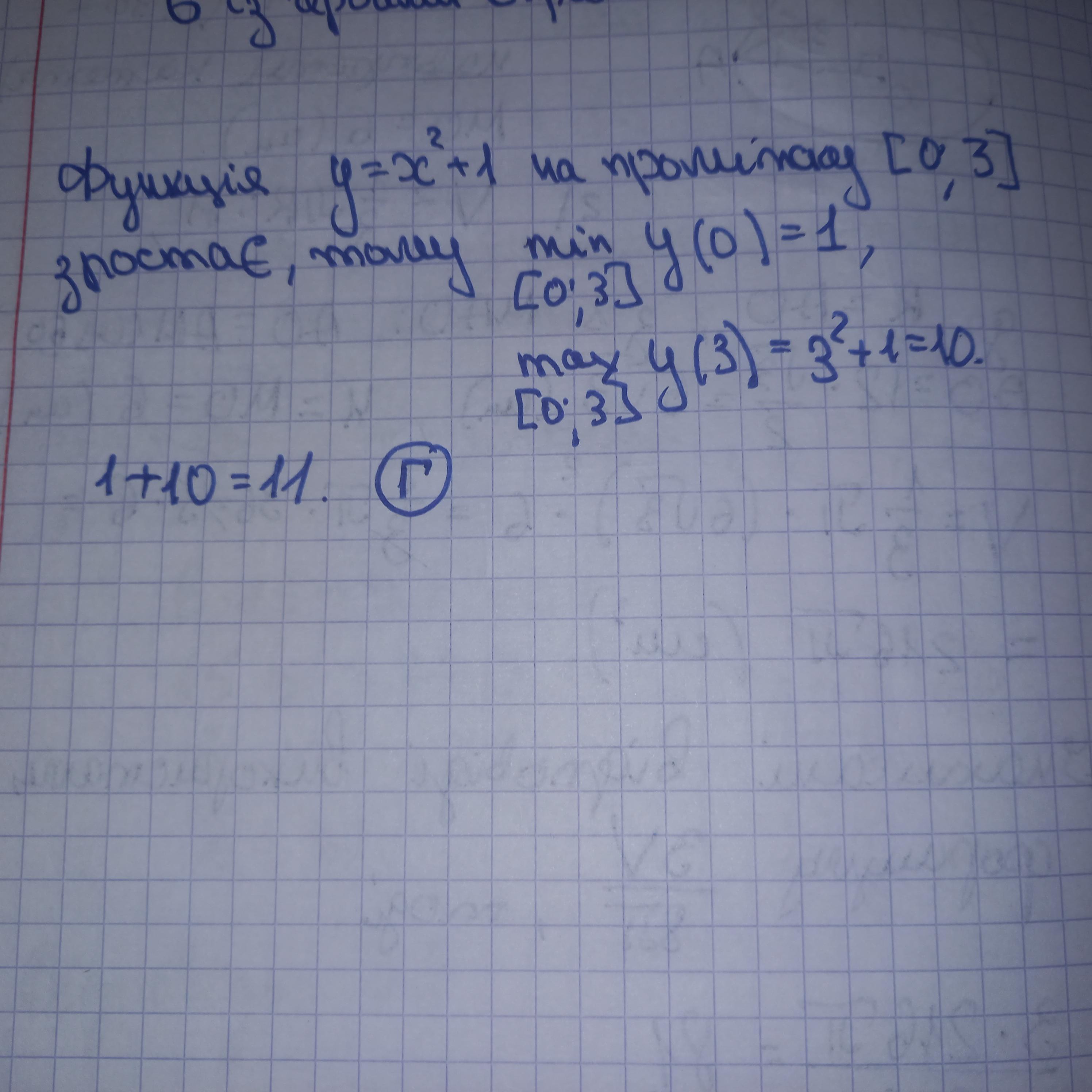 знайти суму найменшого і найбільшого значення функції y=x²+1 на проміжку [0;3] Варіанти відповідей: А)0,Б)12,В)-12,Г)11,Д)-11