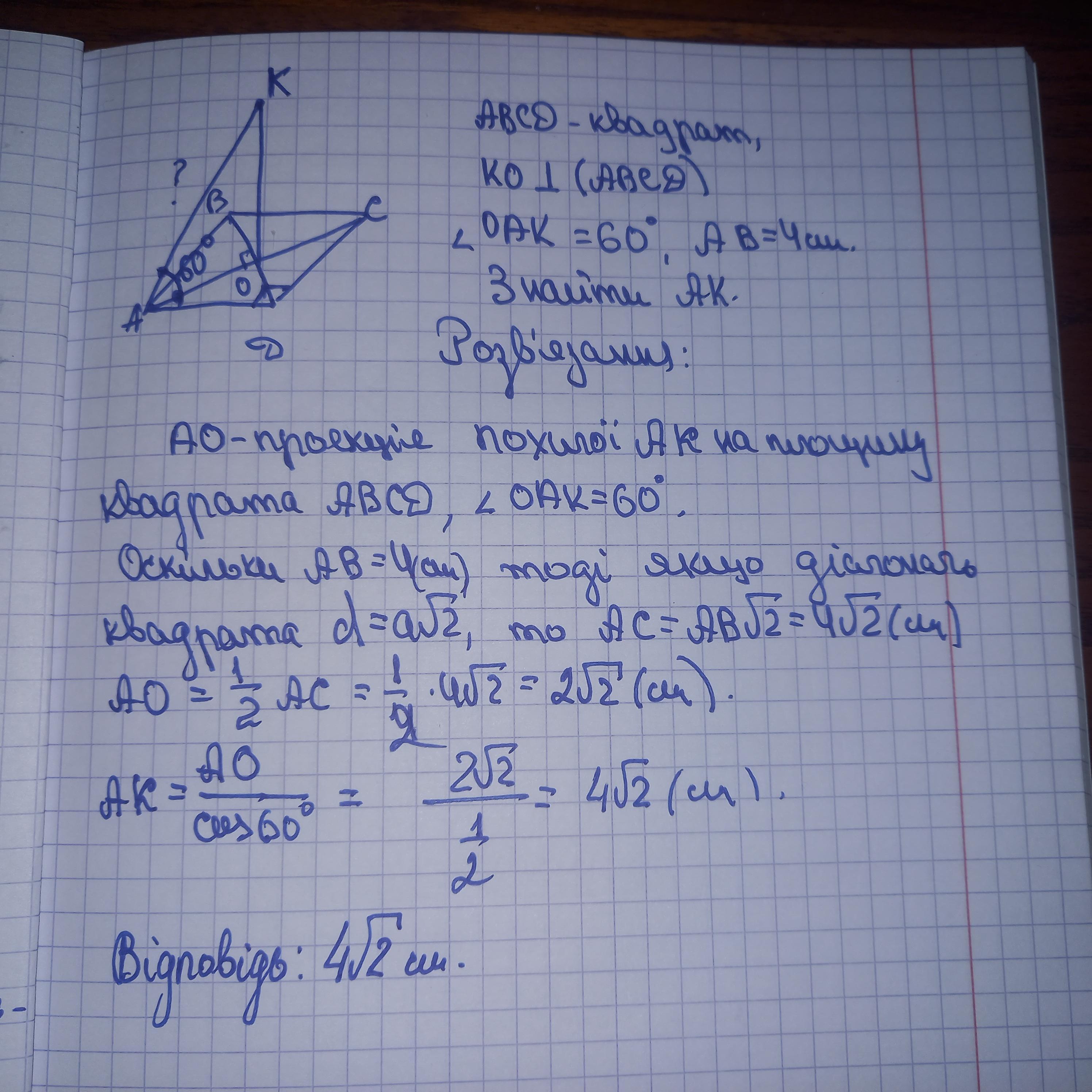 точка О-центр квадрата АВCD,ОК-перпендикуляр до площини квадрата.Пряма АК нахилена до площини квадрата під кутом 60°.Знайдіть довжину відрізка АК,якщо АВ=4см