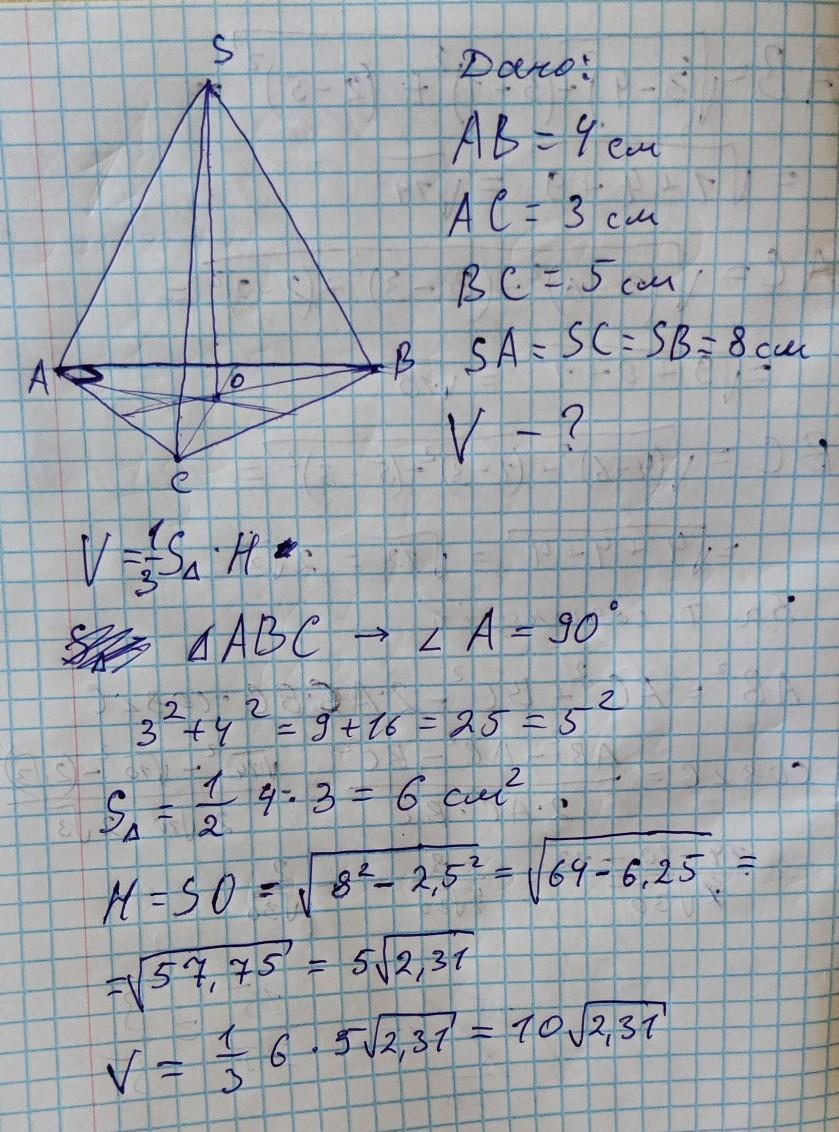 Основанием пирамиды служит треугольник, длины сторон которого 4, 3 и 5 см. Длина бокового ребра равна 8 см. Найдите объем пирамиды.