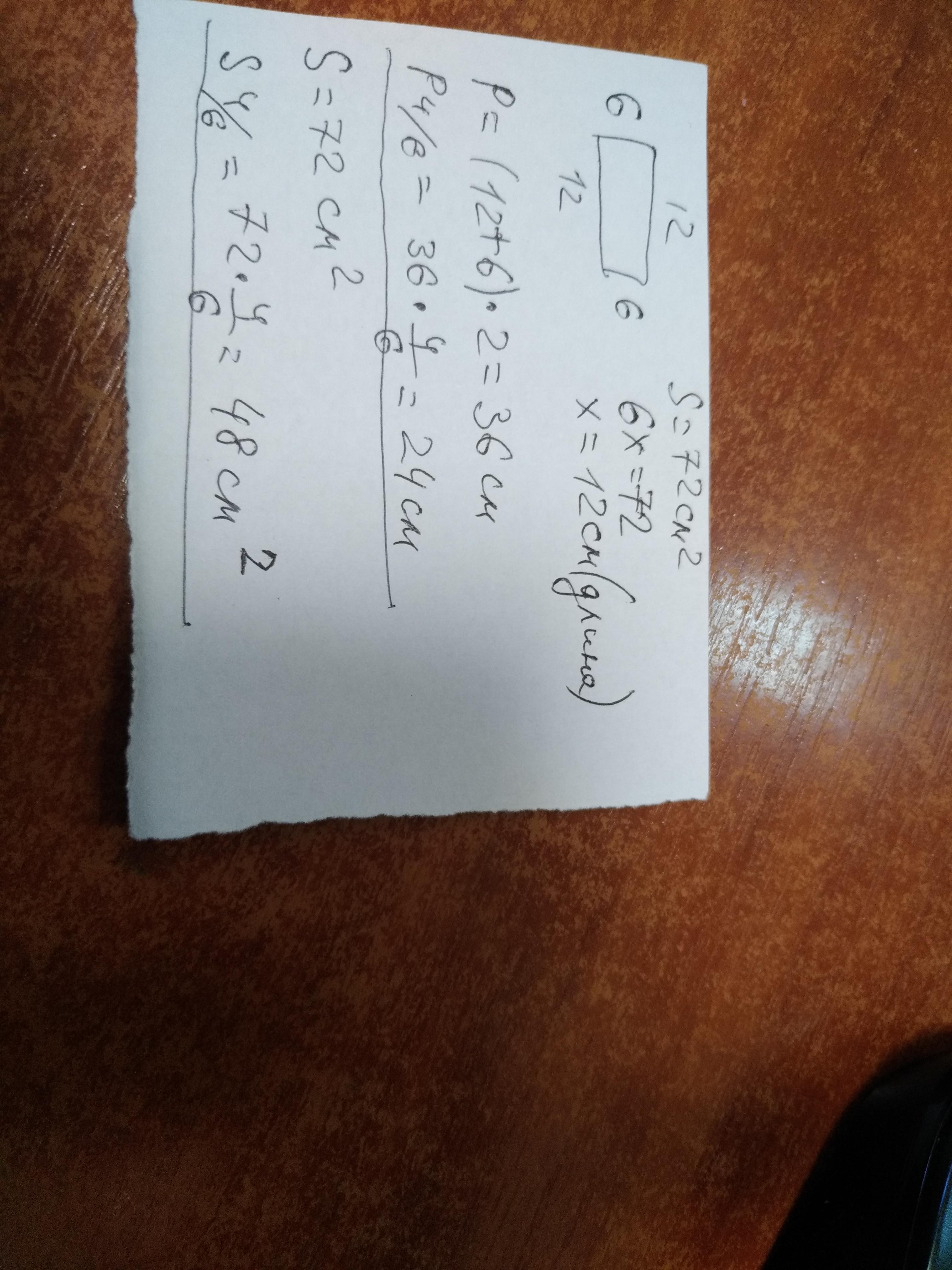 Начерти прямоугольник, у которого ширина равна 6см, а площадь составляет 72см2. Заштрихуй 4/6 этого прямоугольника, вычисли периметр и площадь заштрихованной части.