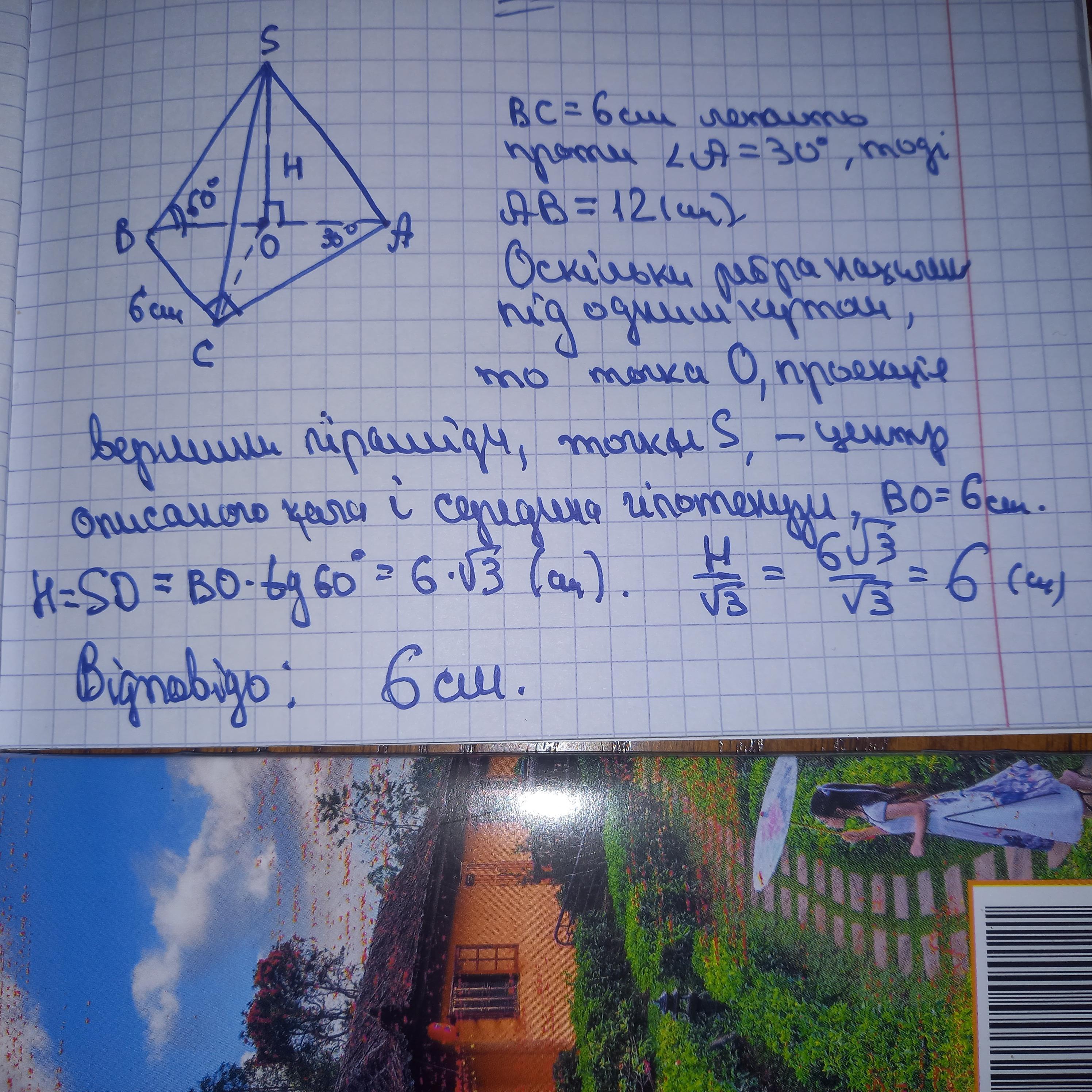 У трикутній піраміді SABC, основою якої є прямокутний трикутник із гострим кутом A=30°, усі бічні ребра нахилені під кутом 60° до основи. Менший катет до основи дорівнює 6 см. Визначте довжину висоти H піраміди SABC. У відповідь запишіть H/√3 у см.