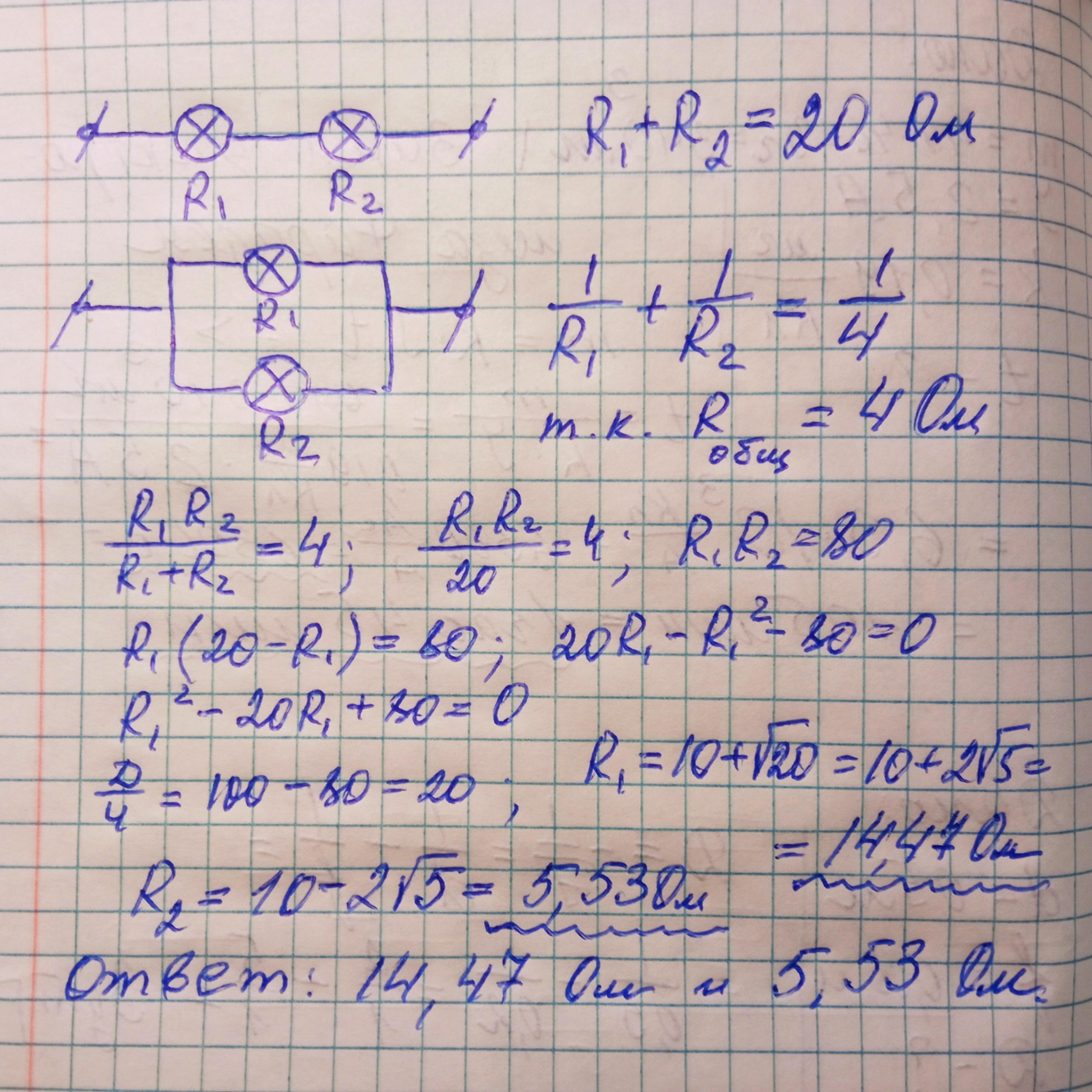 Сопротивление двух электрических ламп при последовательном соединении = 20 Ом,а при параллельном 4 Ом.Найдите сопротивление каждой лампы.