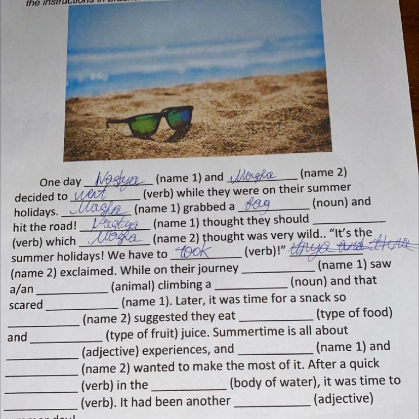 One day Nastya and Masha decided to travel ... holidays. Masha grabbed a bag and .... Nastya thought they should go to zoo which Masha thought was very wild. ..... We have to see wild animals!" Nastya exclaimed. while on their journey Masha saw a monkey climbing a tree and that scared her a little. Later, it was time for a snack so Nastya suggested they eat pancakes and apple juice. summertime is all about fascinating experiences, and Masha and Nastya wanted to make most of it. after a quick swimming in the sea, it was time to return home. it had been another fabulous (чё там последнее слово, невидно)