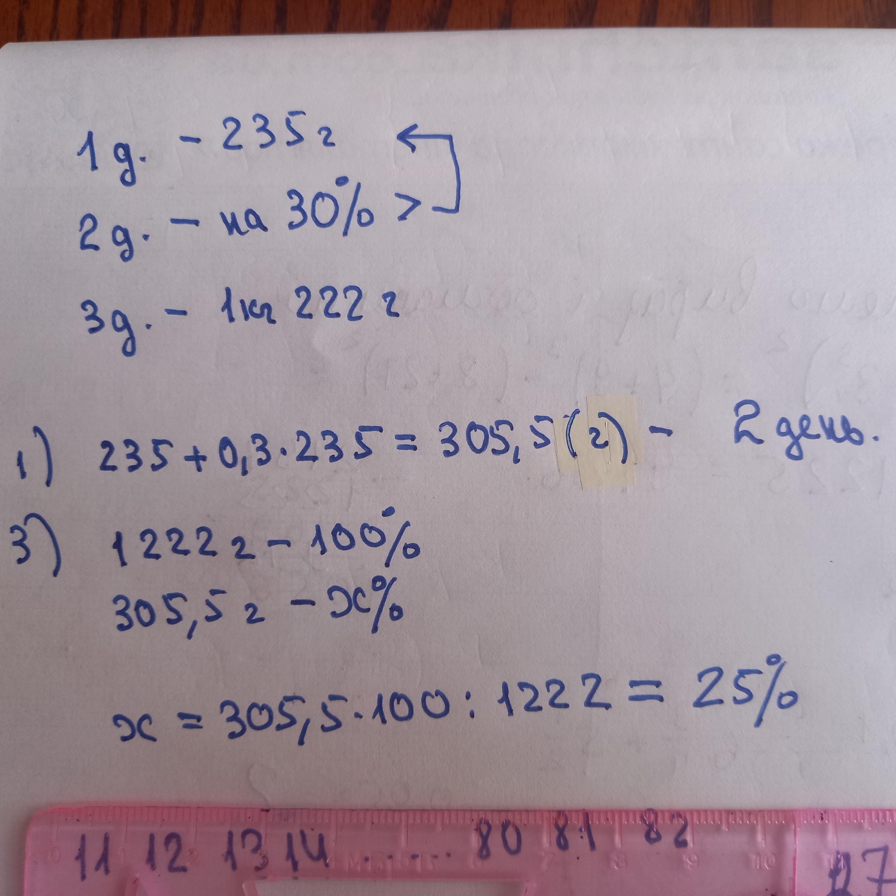 Хозяин дома разложил в мышеловках 235 г сыра. Мыши съели всё, при этом не попалась ни одна. Тогда на следующий день он разложил на 30% больше сыра. Но мыши аккуратно съели и этот сыр. На третий день хозяин дома решил, что не будет пытаться поймать мышей и просто положила им 1 кг 222 г сыра, как угощение. Сколько процентов составляет сыр, съеденный мышами на второй день, от угощения на третий день?