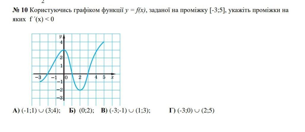 Похідна функції <0 на тих проміжках, де функція спадає. На малюнку функція спадає на проміжку (0; 2). Тому відповідь Б)