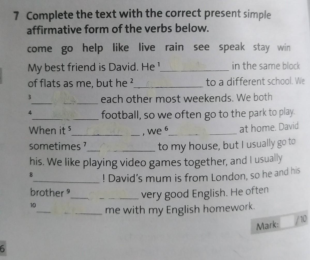 Complete the text with the correct present simple affirmative form of the verbs below. come go help like live rain see speak stay win My best friend is David. He' in the same block of flats as me, but he 2 to a different school. We 3 When it 5 sometimes 7 to my house, but I usually go to his. We like playing video games together, and I usually 8 ! David's mum is from London, so he and his very good English. He often me with my English homework. brother 9 each other most weekends. We both football, so we often go to the park to play. we 6 at home. David 10