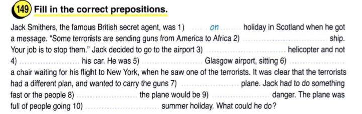 Jack Smothers the famous British secret agent, was 1) on holiday. in Scotland when he got a message, "Some terrorists are sending guns from America to Africa 2) ..... ship. Your job is stop them." Jack decided to go to the airport 3) ..... helicopter and not 4) ..... his car. He was 5) ..... Glasgow airport, sitting 6) ..... a chair waiting for his fight to New York, when he saw one of the terrorists. It was clear that the terrorists had a different plan, and wanted to carry the guns 7) ..... plane. Jack had to do something fast or the people 8) ..... the plane would be 9) ..... danger. The plane was full of people going 10) ..... summer holiday. What could he do?