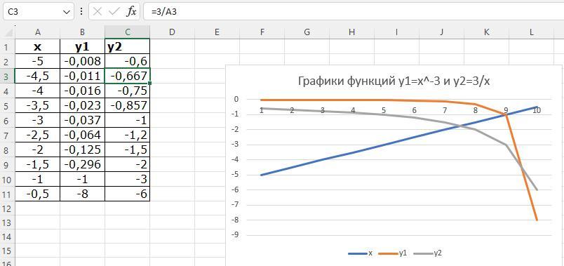 на интервале [- 5 ; -0,5] с шагом 0,5.