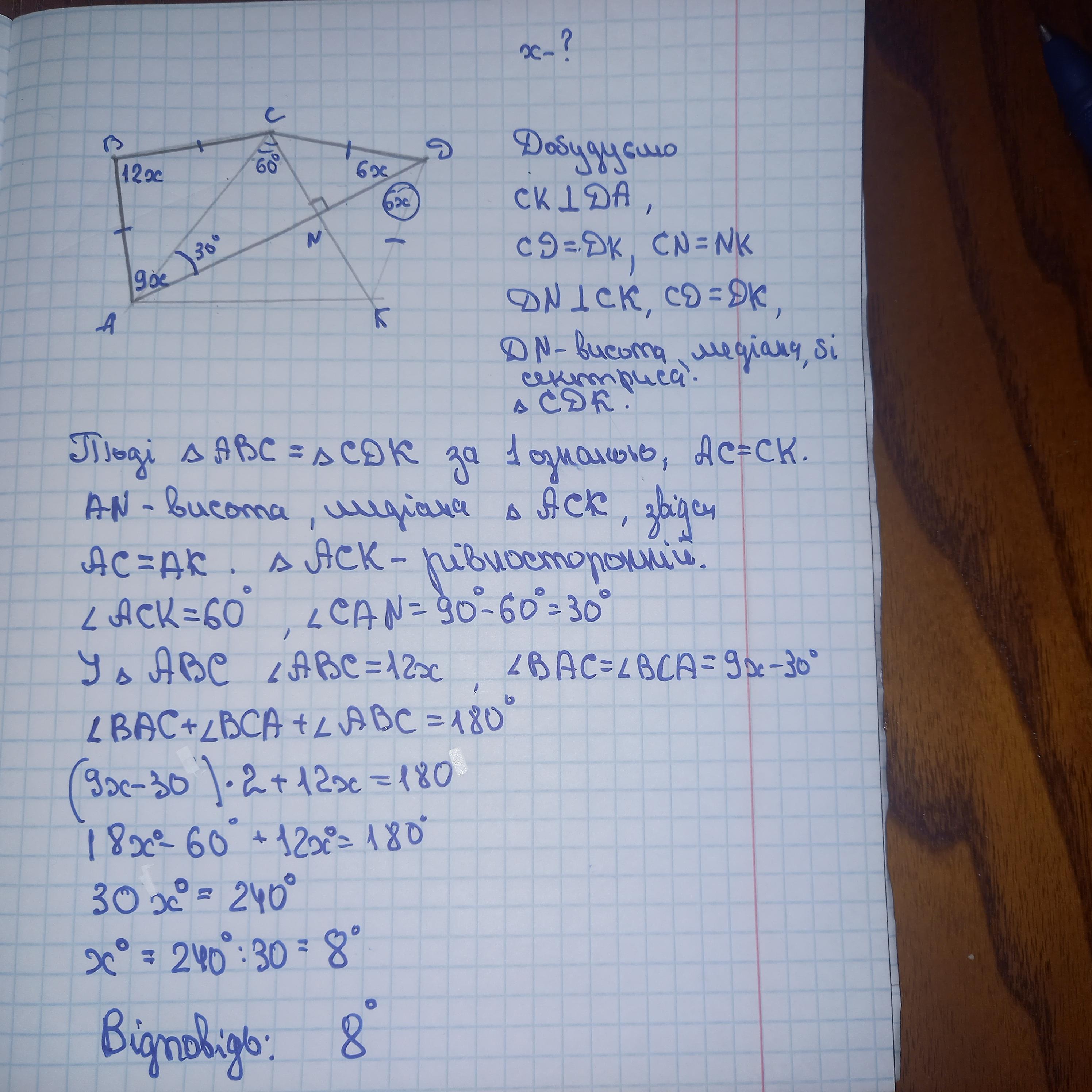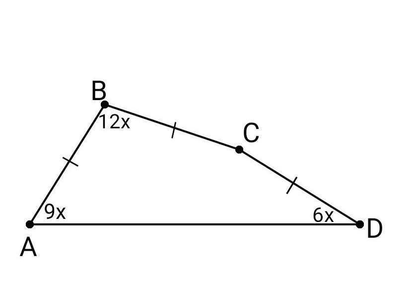 Дан четырехугольник ABCD; AB=BC=CD. ∠A=9x°; ∠B=12x°; ∠D=6x°. Чему равно х?