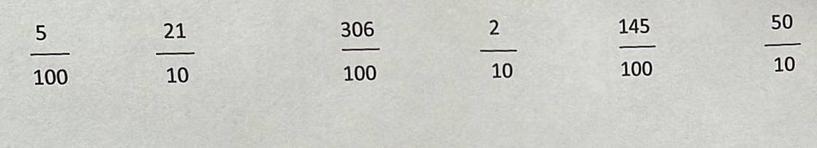 5/100=0.05 ; 21/10=2.1 ; 306/100= 3.06 ; 2/10=0.2, 145/100=1.45 ; 50/10=5.