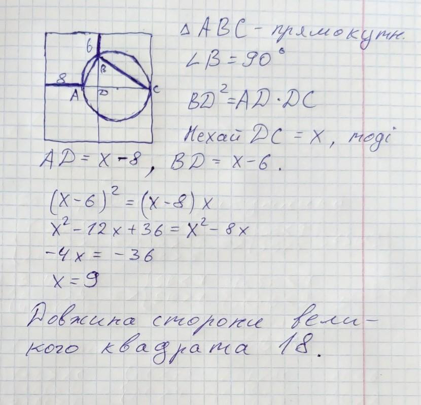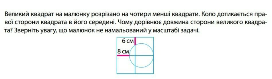 Большой квадрат на рисунке разрезан на четыре меньших квадрата. Окружность касается правой стороны квадрата в его середине. Чему равна длина стороны большого квадрата?