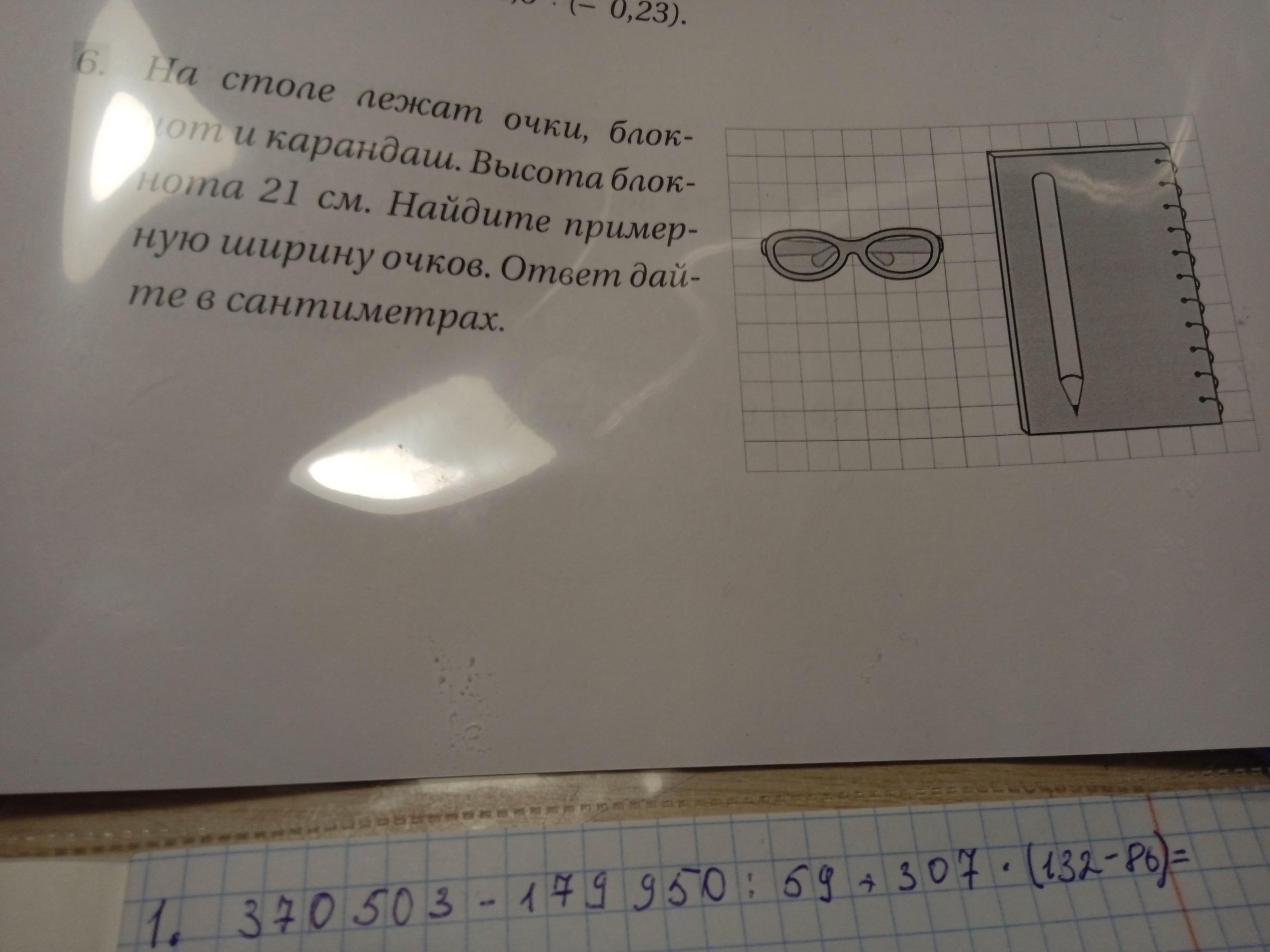 Мы знаем, что высота блокнота 21см, на рисунке он занимает 10 клеток. Очки в свою очередь занимают 6 клеток, значит можно составить пропорцию.