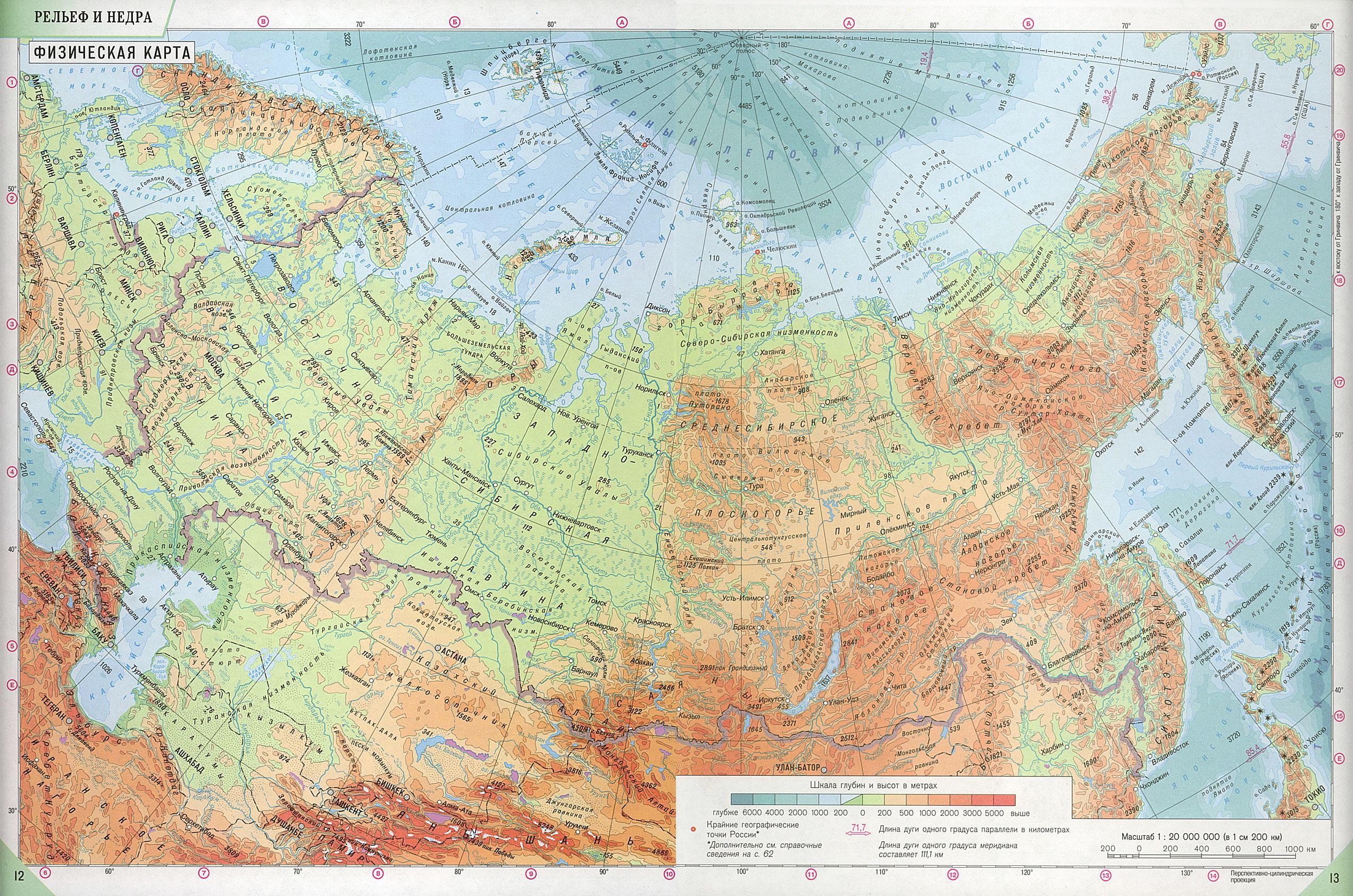 Найбільші рівнини – Східно-Європейська, Західно-Сибірська, а також Середньосибірське плоскогір'я. Найвища точка- гора Ельбрус, її висота 5642 метри, найнижча точка з висотою 28 метрів знаходиться на Прикаспійській низовині.