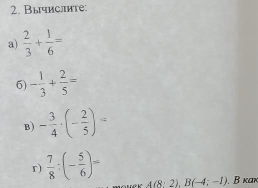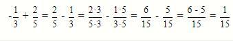 б) -1/3+2/5 = (-1*5)/(3*5) + (2*3)/(5*3) = -5/15 + 6/15 = 6/15 - 5/15 = 1/15.