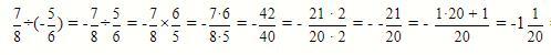 г) 7/8 : (-5/6) = 7/8 * (-6/5) = -(7*6) / (8*5) = -42/40 = -21/20 = -1.05.