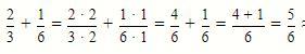 a) 2/3 + 1/6 = (2*2)/(3*2) + 1/6 = 4/6 +1/6 = 5/6.