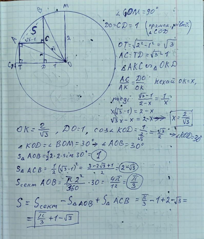 Зовні прямого кута з вершиною С на продовженні його бісектриси взято точку О таку, що ОС=√2. З центром в точці О побудовано коло з радіусом 2. Знайти площу фігури , обмеженої сторонами кута і дугою кола, що розташована між ними.