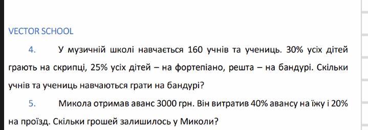 1) 30 + 25 = 55 (%) - всех учеников играют на скрипке и на фортепиано