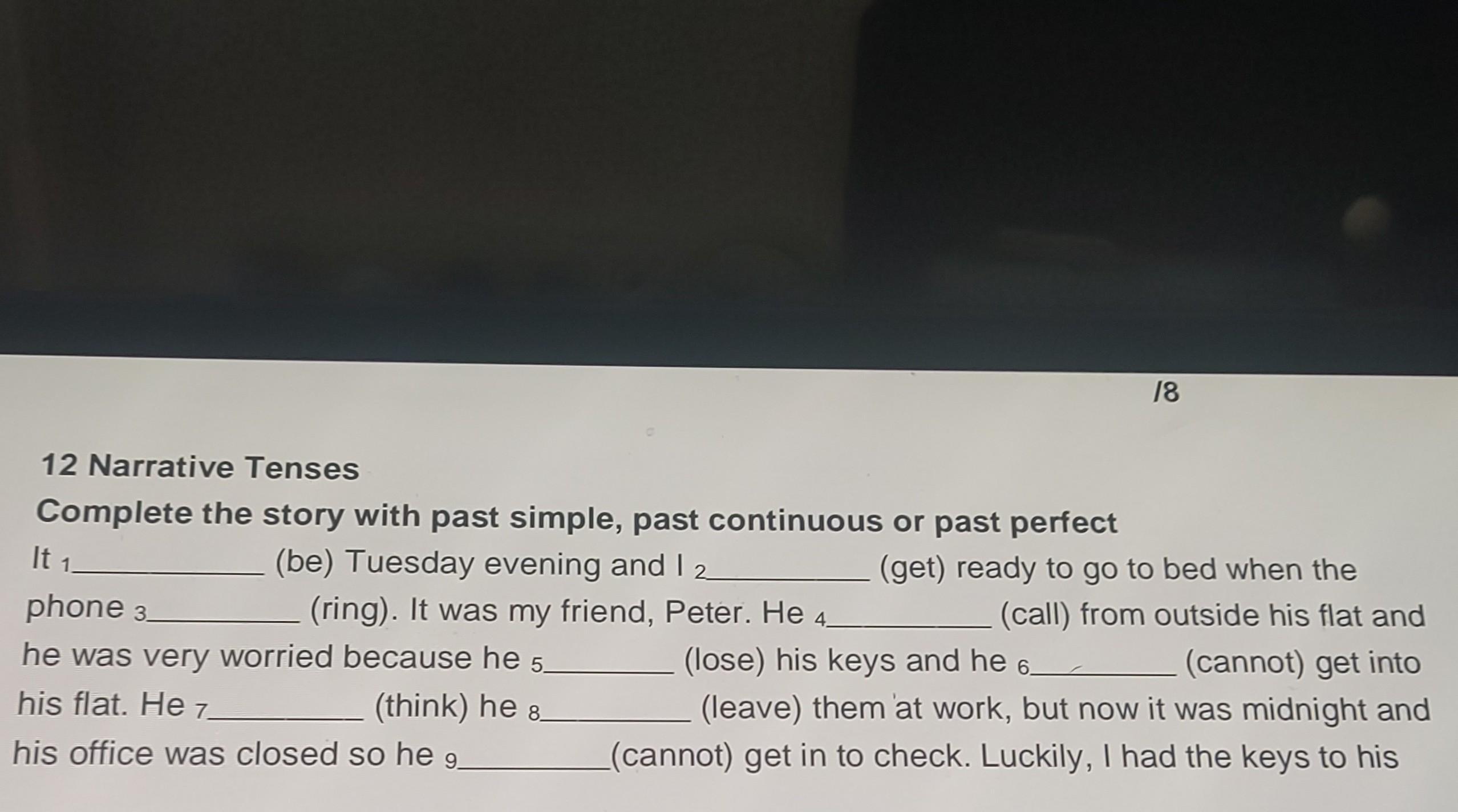 It 1)was Tuesday evening and I 2)was getting ready to go to bed when the phone 3)rang. It was my friend, Peter. He 4)called from outside his flat and he was very worried because he 5)had lost his keys and he 6)couldn't get into his flat. He 7)thought he 8)had left them at work, but now it was midnight and his office was closed so he 9)couldn't get in to check. Luckily, I had the keys to his flat.