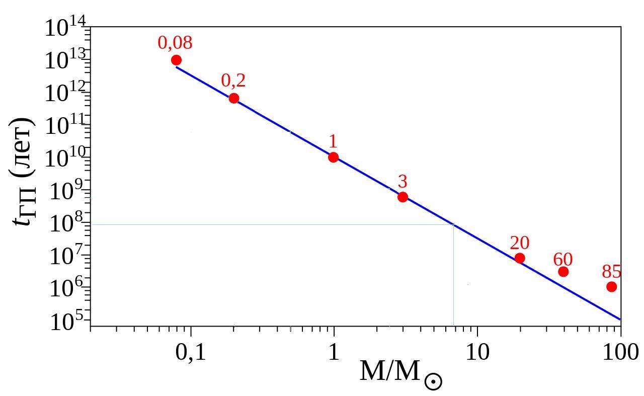 Поскольку для вычисления времени пребывания звезды на главной последовательности надо знать светимость звезды, которая нам не задана, то можно воспользоваться графиком приближенной зависимости времени пребывания звезды на главной последовательности от её массы (см. рисунок). Вначале определяем показатель степени, в которую надо возвести 10, что бы получить 80000000 лет. Это будет, примерно, 10^7,9