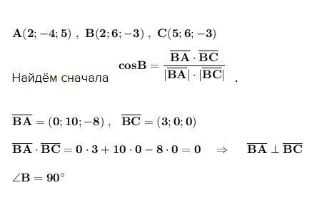 Трикутник АВС задано координатами вершин: А(2;-4;5); В(2;6;-3); С(5;6;-3). Знайдіть градусну міру кута В.