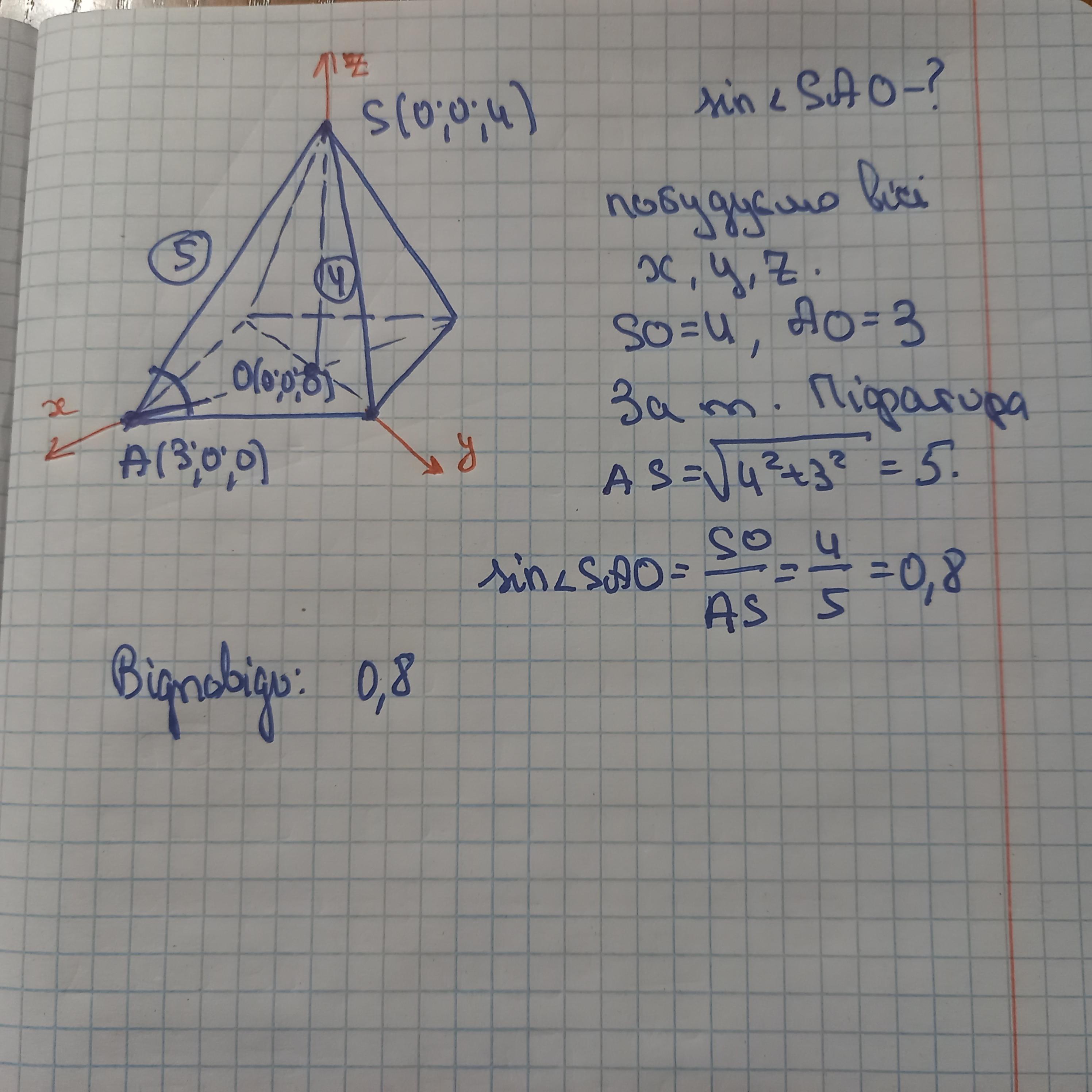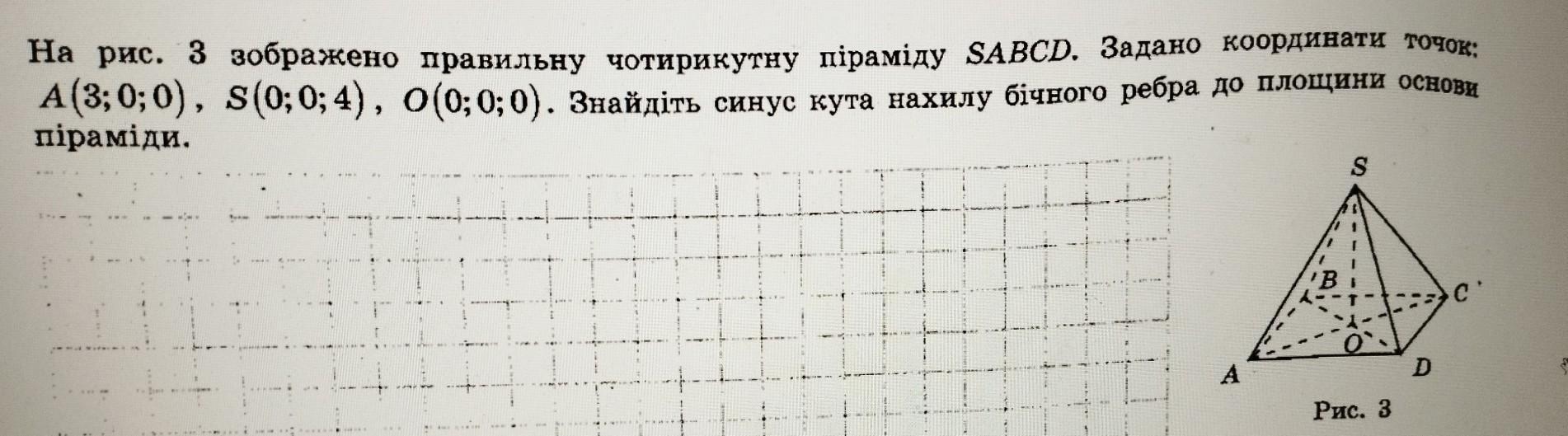 На рис. 3 зображено правильну чотирикутну піраміду SABCD. Задано координати точок: A(3;0;0), S(0;0;4), O(0;0;0). Знайдіть синус кута нахилу бічного ребра до площини основи піраміди. (див малюнок)