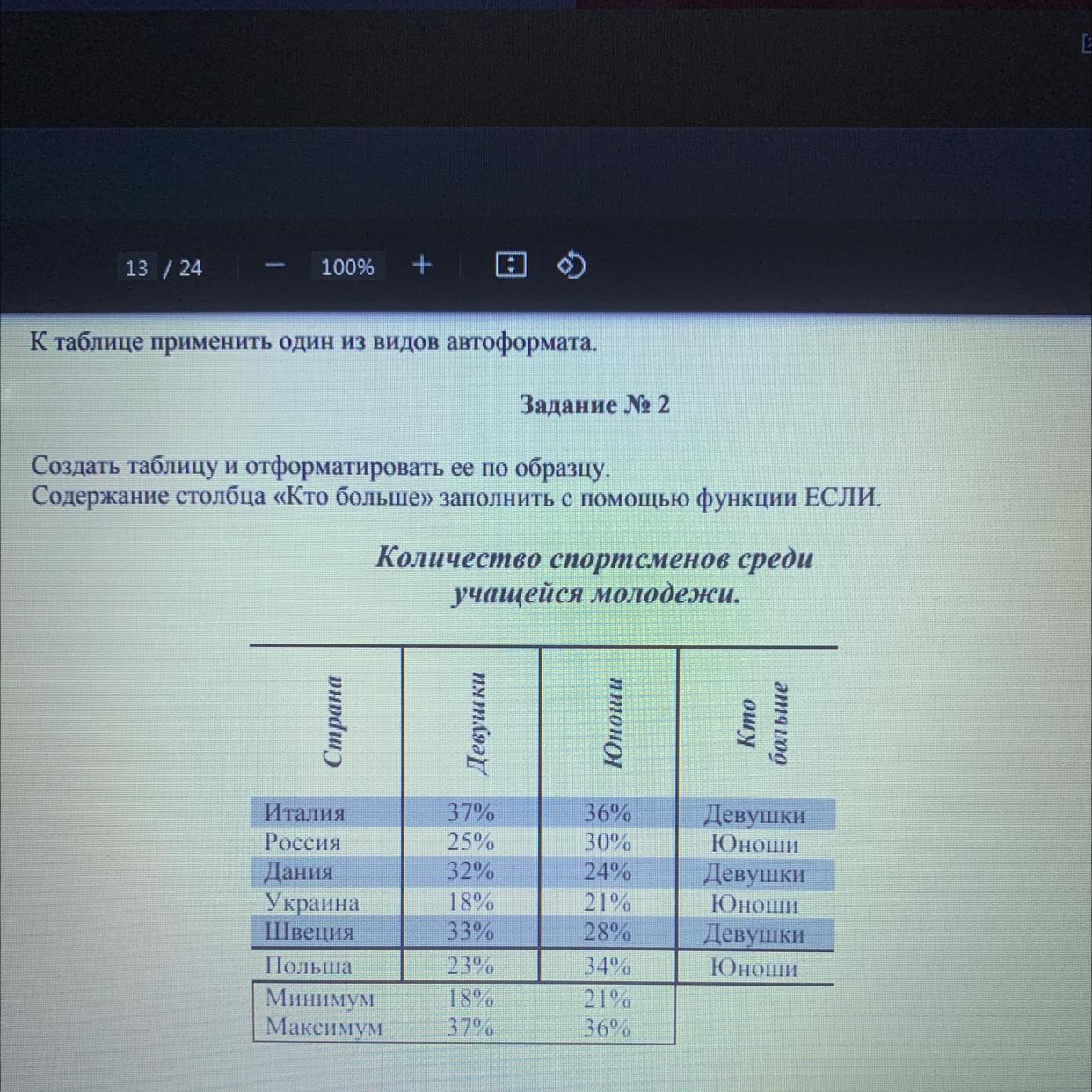 1) =ЕСЛИ(B8>C8;"Девушки";"Юноши")