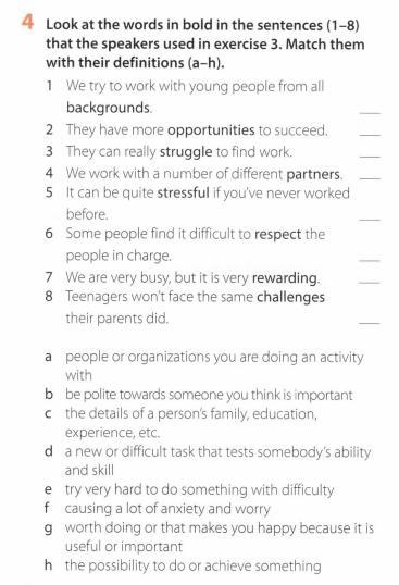 Look at the words in bold in the sentences (1-8) that the speakers used in exercise 3. Match them with their definitions (a-h)