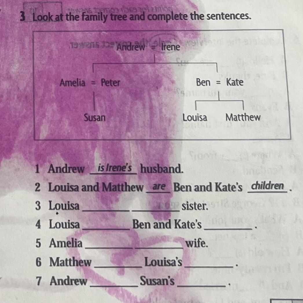 3. Louisa is Matthew's sister. 4. Louisa is Ben and Kate's daughter. 5. Amelis is Peter's wife. 6. Matthew is Louisa's brother. 7. Andrew is Susan's grandfather.