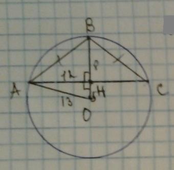 169=144+ОН²; ОН²=169-144=25; ОН=5см