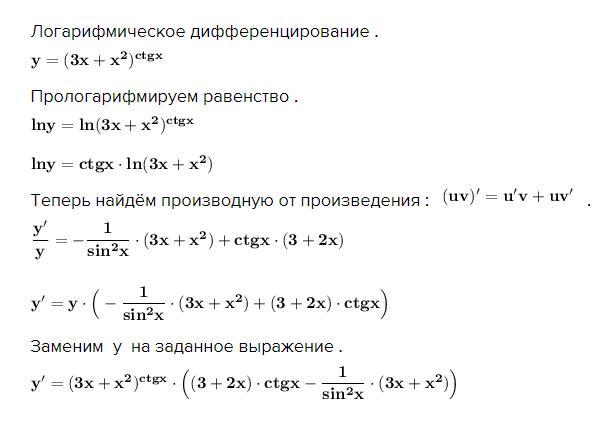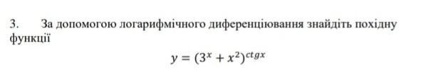 Помогите пожалуйста 3. За допомогою логарифмічного диференціювання знайдіть похiдну функцiï y = (3x + x2)ctgx