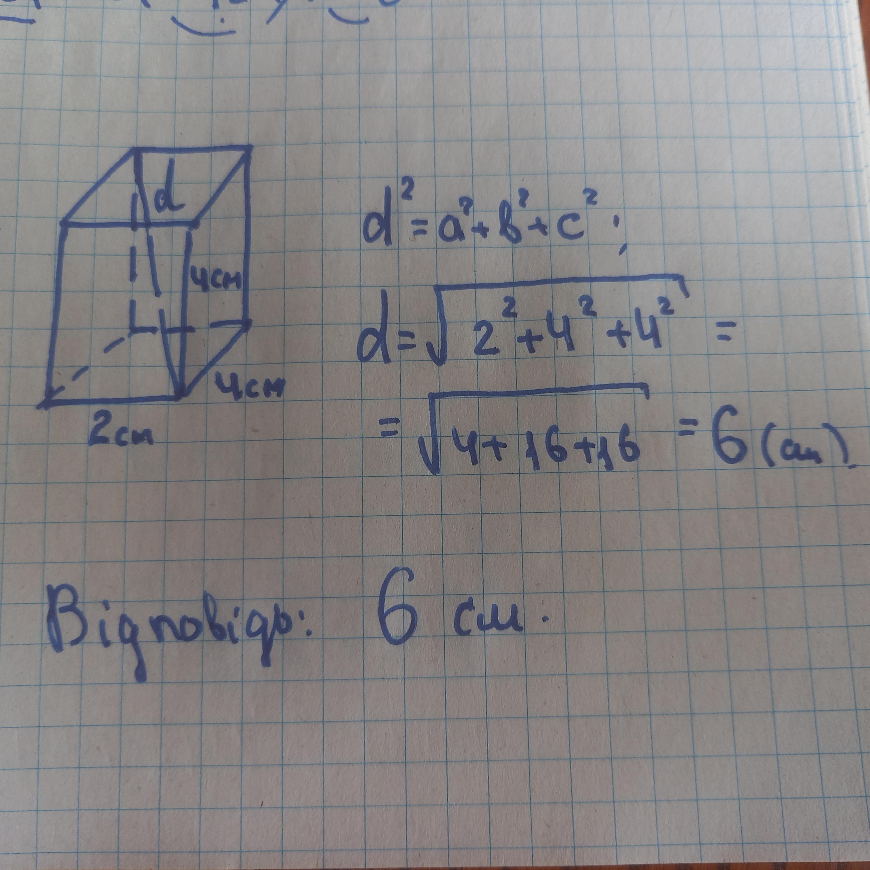 Знайдіть діагональ прямокутного паралелепіпеда, якщо його лінійні виміри відповідно дорівнюють 2см, 4 см, 4см.